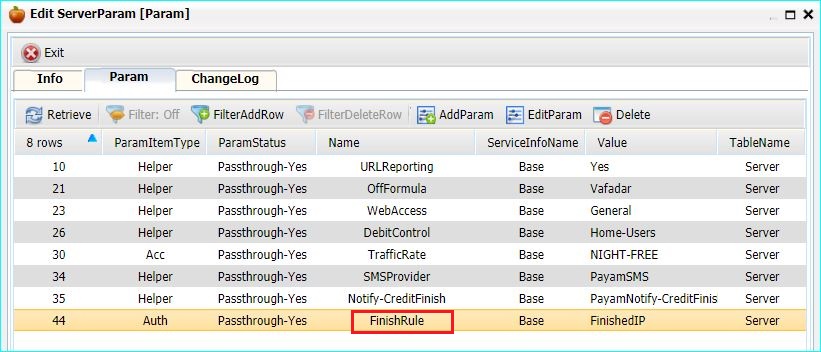 مثال 3: در صورتی که بخواهیم به مناسبتی خاص در یک روز مصرف تمامی کاربران یک VISP را رایگان کنیم می بایست در قسمت Param از آن VISP مقدار TrafficRate تعریف شده به صورت رایگان را اعمال کنیم. در این حالت بهتر است مقدارPassthrough-No انتخاب شود تا در صورتی که به عنوان مثال در سطحی پایین تر مقدار TrafficRate نیمه بها تعریف شده باشد، در نظر گرفته نشود و برای تمامی کاربران ضریب صفر در نظر گرفته شده در VISP اعمال گردد.
